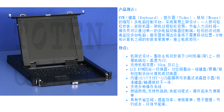 LCD KVM四合一切换器,1U空间整合一组键盘/屏幕/鼠标控制多台计算机或切换器;即插即用,支持热插拔,免驱动程式,操作起来方便简单;节省空间、提高效率、易于管理、节约成本。