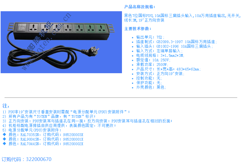 黑色7位国标PDU,10A国标三扁插头输入,10A万用插座输出,无开关,线长3M,19"正方向安装