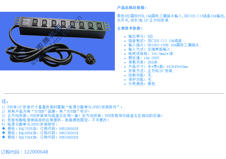 黑色8位国标PDU,16A国标三扁插头输入,IEC320 C13插座10A输出,无开关,线长3M,19"正方向安装