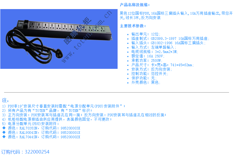 黑色12位国标PDU,16A国标三扁插头输入,10A万用插座输出,带总开关,线长3米,反方向安装