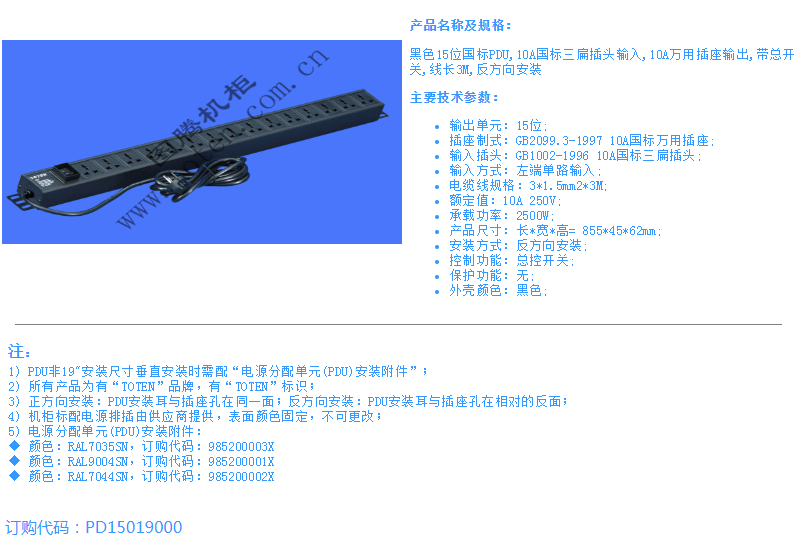 黑色15位国标PDU,10A国标三扁插头输入,10A万用插座输出,带总开关,线长3M,反方向安装