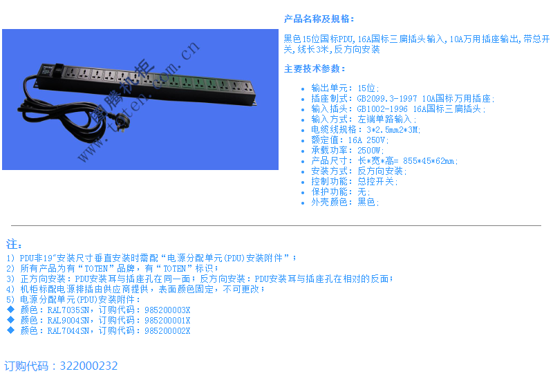 黑色15位国标PDU,16A国标三扁插头输入,10A万用插座输出,带总开关,线长3米,反方向安装