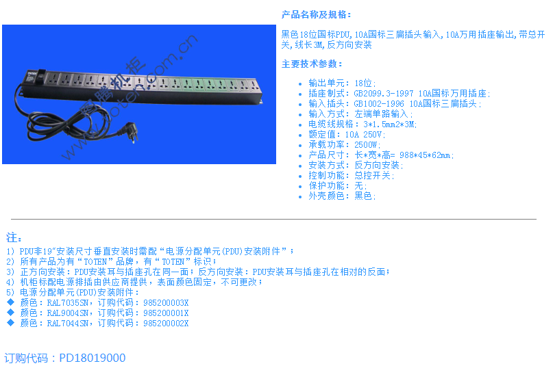 黑色18位国标PDU,10A国标三扁插头输入,10A万用插座输出,带总开关,线长3M,反方向安装
