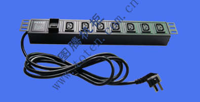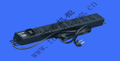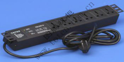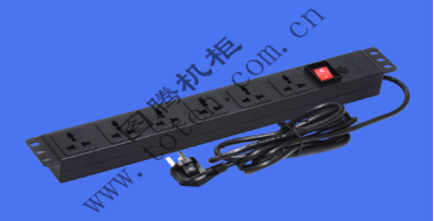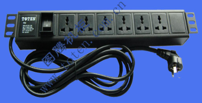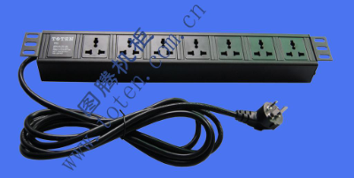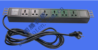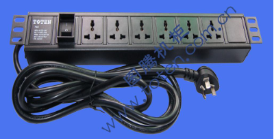 黑色6位国标电源排插,10A输入10A万用输出,带过载保护及带灯总开关,电源线3*0.75*1.8M,安装耳与上面板为一体,19"正方向安装,机柜标配电源排插,带"TOTEN"标识