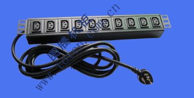 黑色10位国标PDU,10A国标三扁插头输入,IEC320 C13插座10A输出,无开关,线长3M,左端双路输入,19"正方向安装